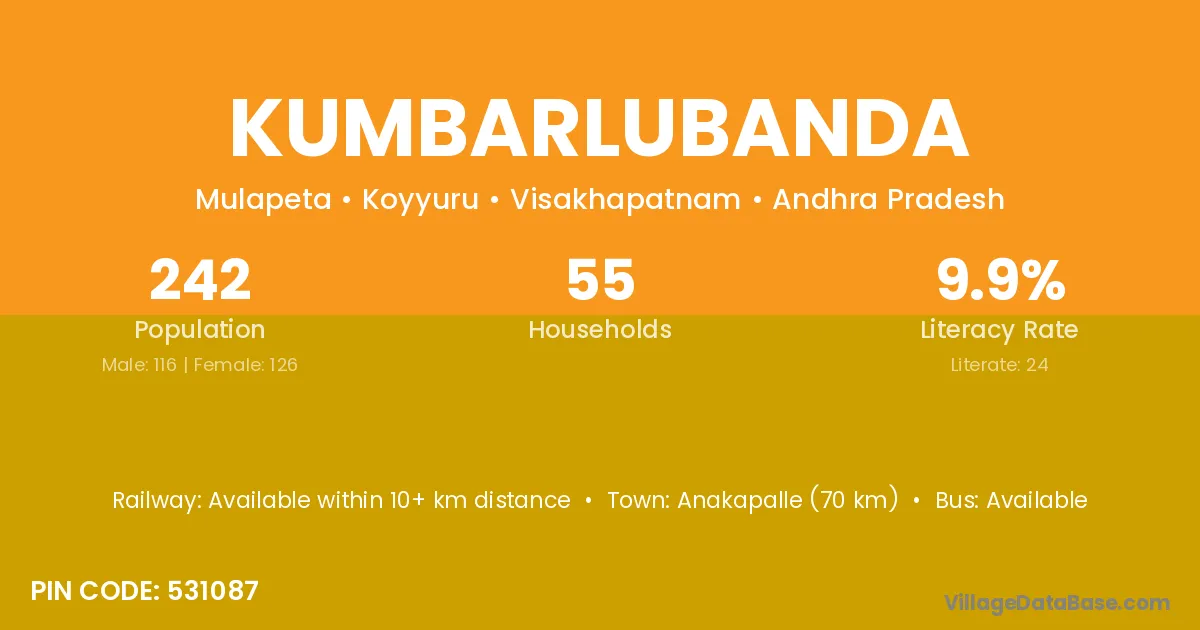 Anakapalle (70 km) is the nearest town to Kumbarlubanda village for major economic activities and is located approximately 70 km away.