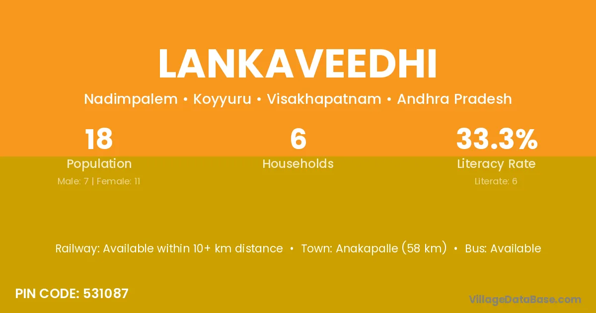 Anakapalle (58 km) is the nearest town to Lankaveedhi village for major economic activities and is located approximately 58 km away.