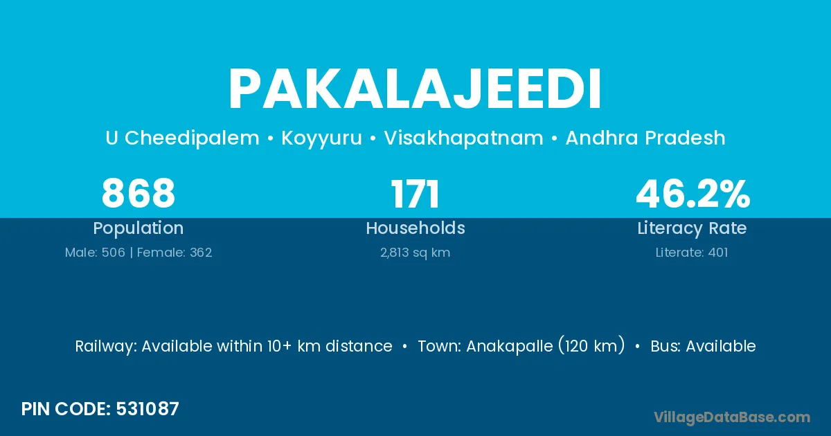 Anakapalle (120 km) is the nearest town to Pakalajeedi village for major economic activities and is located approximately 120 km away.