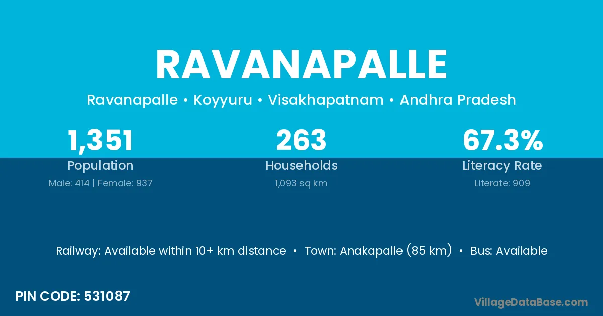 Anakapalle (85 km) is the nearest town to Ravanapalle village for major economic activities and is located approximately 85 km away.