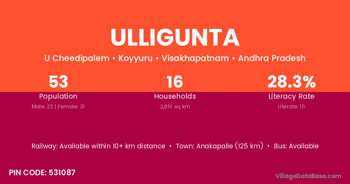 Anakapalle (125 km) is the nearest town to Ulligunta village for major economic activities and is located approximately 125 km away.