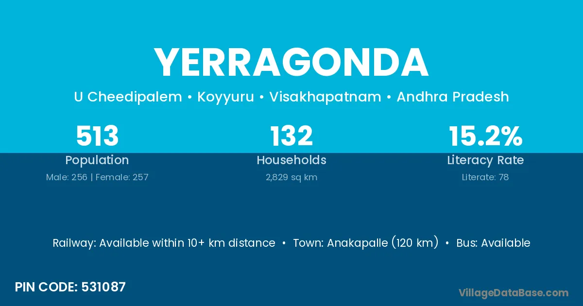 Anakapalle (120 km) is the nearest town to Yerragonda village for major economic activities and is located approximately 120 km away.