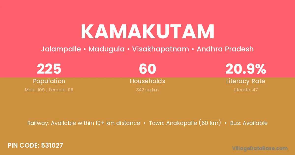 Anakapalle (60 km) is the nearest town to Kamakutam village for major economic activities and is located approximately 60 km away.