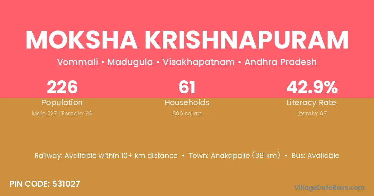 Anakapalle (38 km) is the nearest town to Moksha Krishnapuram village for major economic activities and is located approximately 38 km away.