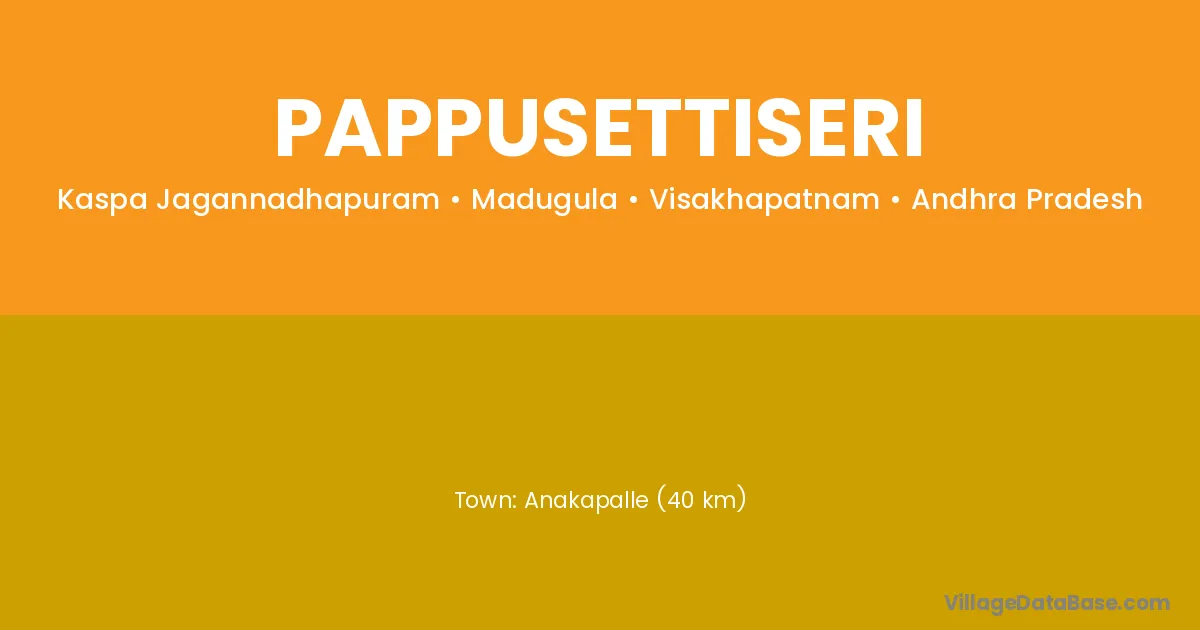 Anakapalle (40 km) is the nearest town to Pappusettiseri village for major economic activities and is located approximately 40 km away.