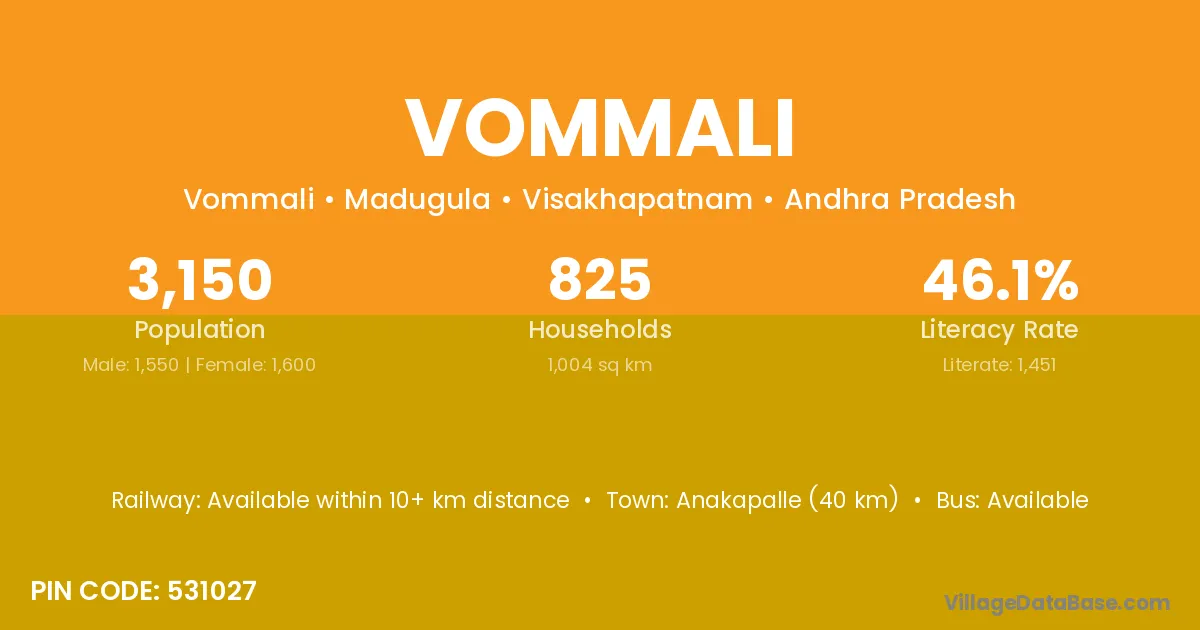 Anakapalle (40 km) is the nearest town to Vommali village for major economic activities and is located approximately 40 km away.