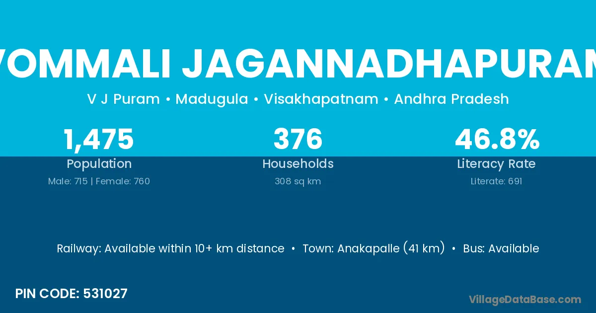 Anakapalle (41 km) is the nearest town to Vommali Jagannadhapuram village for major economic activities and is located approximately 41 km away.