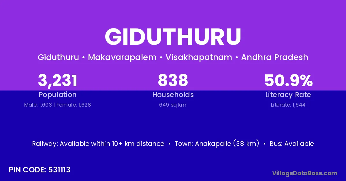 Anakapalle (38 km) is the nearest town to Giduthuru village for major economic activities and is located approximately 38 km away.