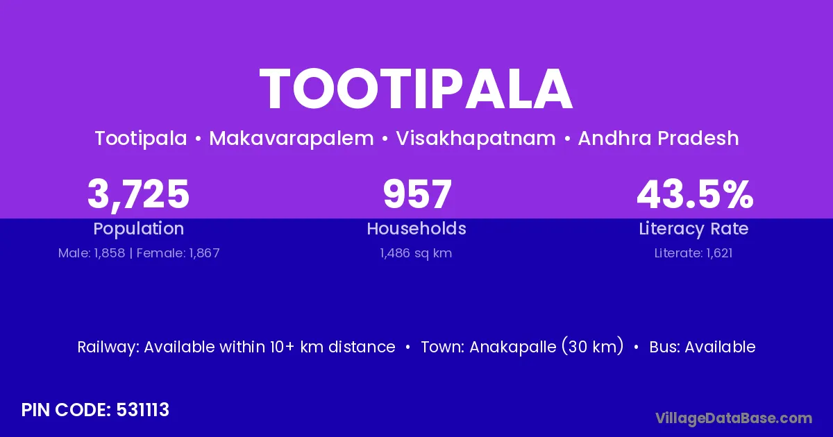 Anakapalle (30 km) is the nearest town to Tootipala village for major economic activities and is located approximately 30 km away.
