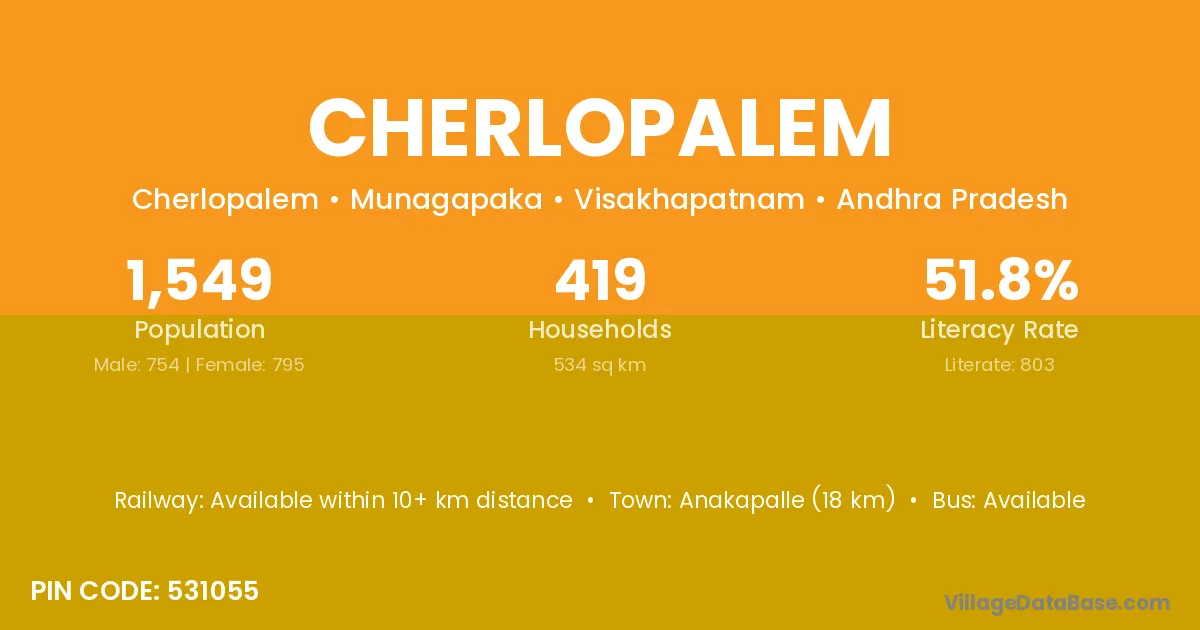 Anakapalle (18 km) is the nearest town to Cherlopalem village for major economic activities and is located approximately 18 km away.