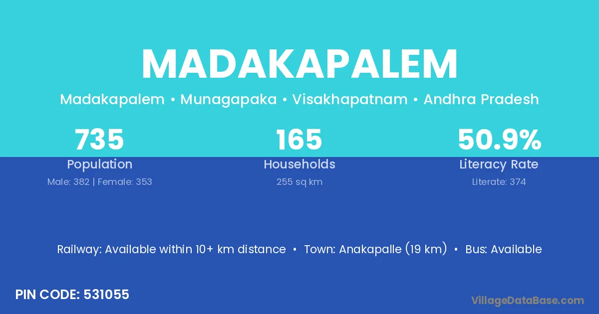 Anakapalle (19 km) is the nearest town to Madakapalem village for major economic activities and is located approximately 19 km away.