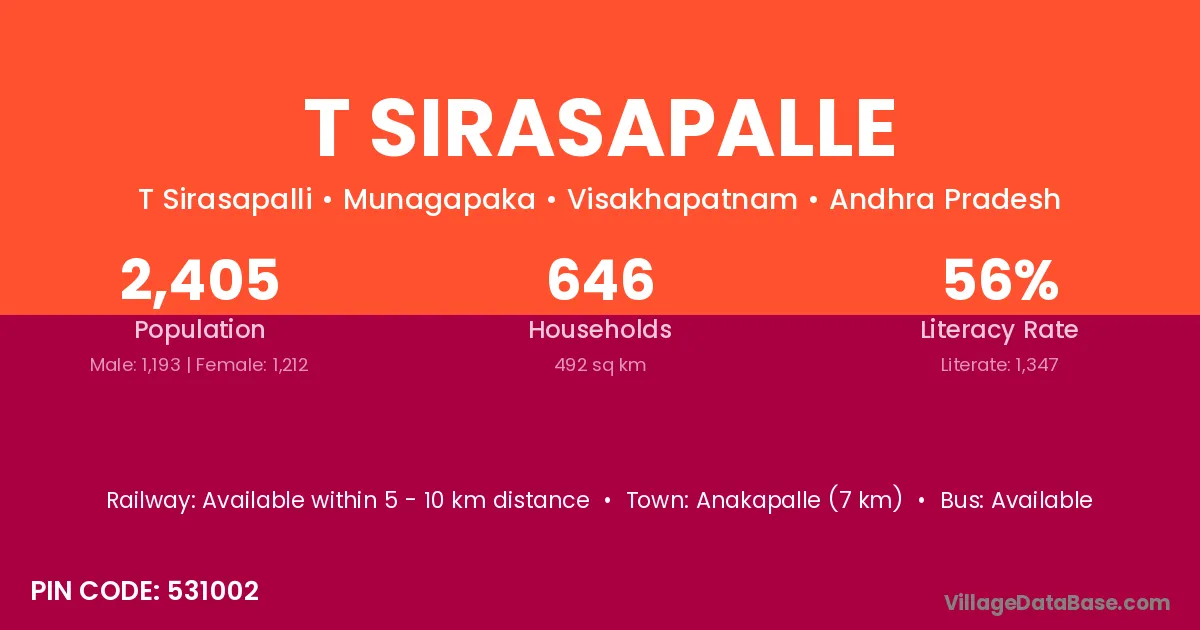 Anakapalle (7 km) is the nearest town to T Sirasapalle village for major economic activities and is located approximately 7 km away.