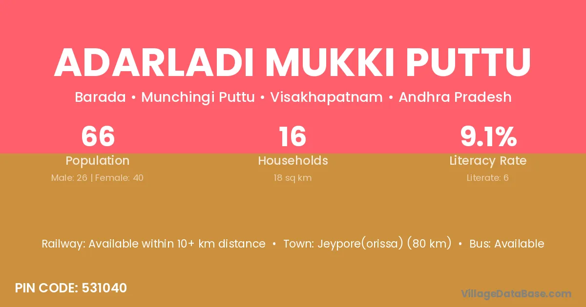Adarladi Mukki Puttu village has a total population of 66 people, of which 26 are males and 40 are females.