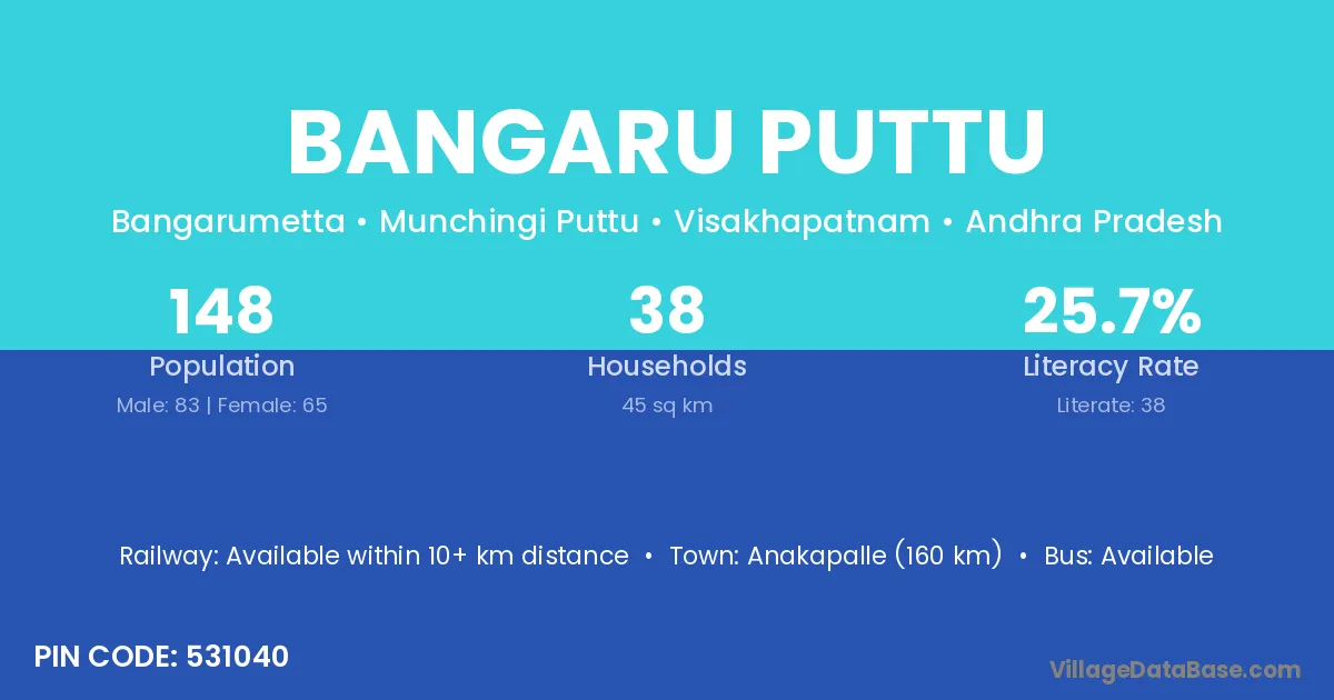 Bangaru Puttu village has a total population of 148 people, of which 83 are males and 65 are females.