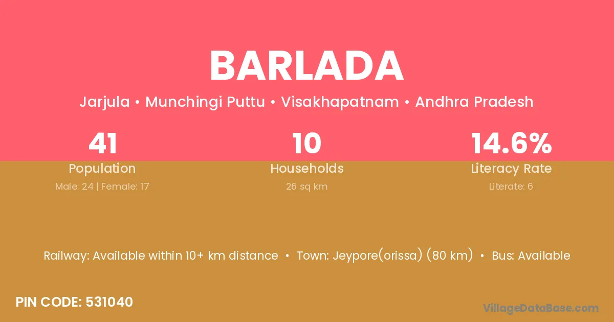 Barlada village has a total population of 41 people, of which 24 are males and 17 are females.