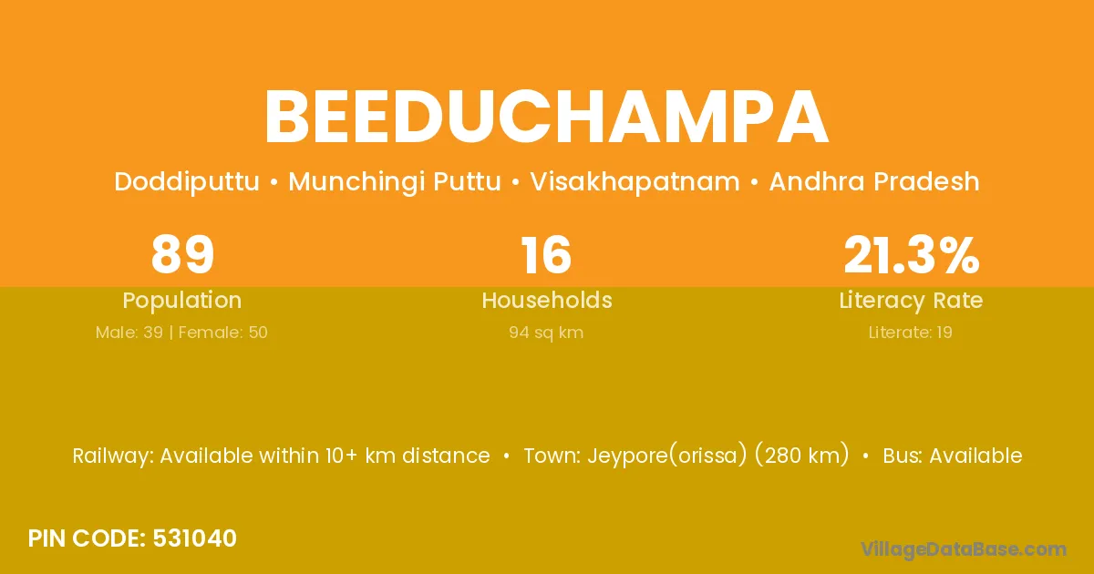 Beeduchampa village has a total population of 89 people, of which 39 are males and 50 are females.