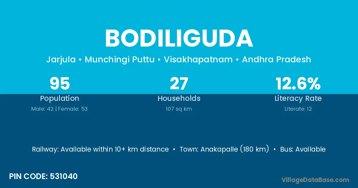 Anakapalle (180 km) is the nearest town to Bodiliguda village for major economic activities and is located approximately 180 km away.