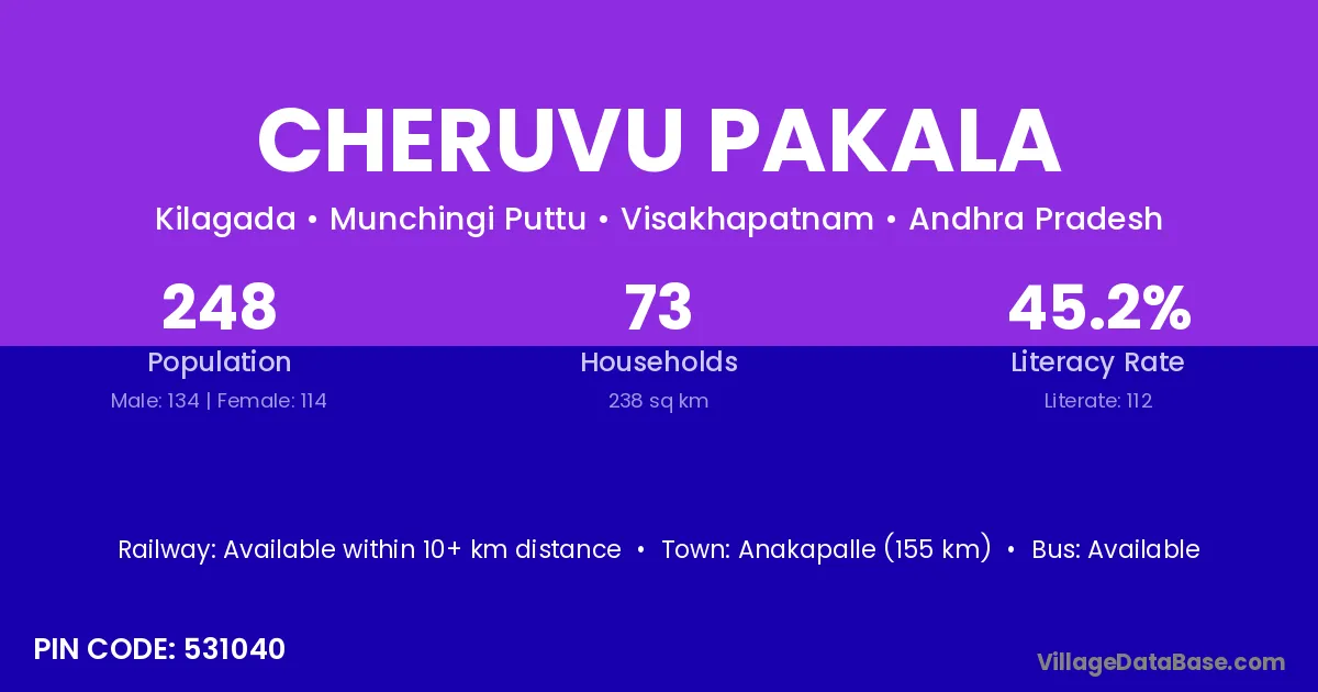 Cheruvu Pakala village has a total population of 248 people, of which 134 are males and 114 are females.