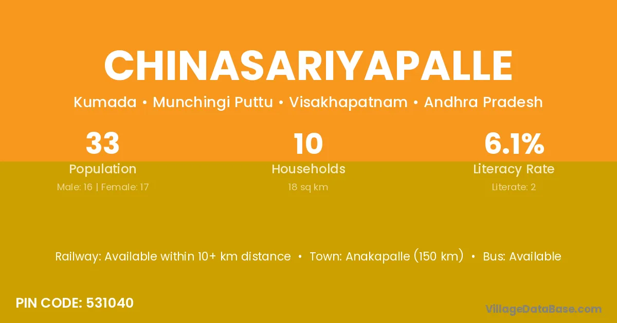 Chinasariyapalle village has a total population of 33 people, of which 16 are males and 17 are females.