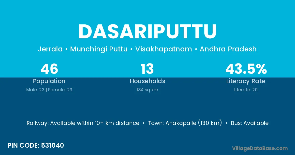 Anakapalle (130 km) is the nearest town to Dasariputtu village for major economic activities and is located approximately 130 km away.