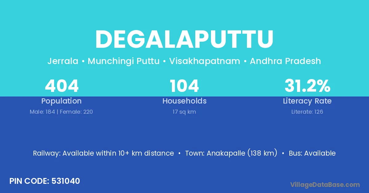 Anakapalle (138 km) is the nearest town to Degalaputtu village for major economic activities and is located approximately 138 km away.