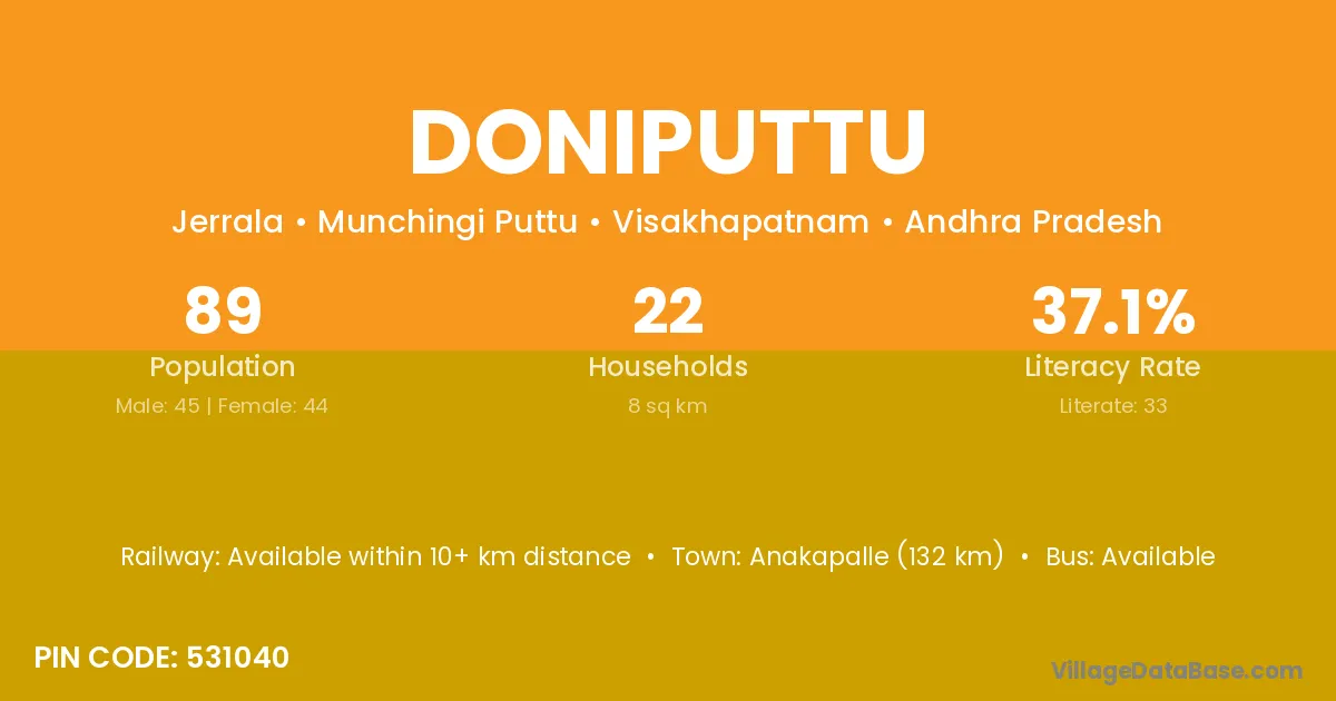 Doniputtu village has a total population of 89 people, of which 45 are males and 44 are females.