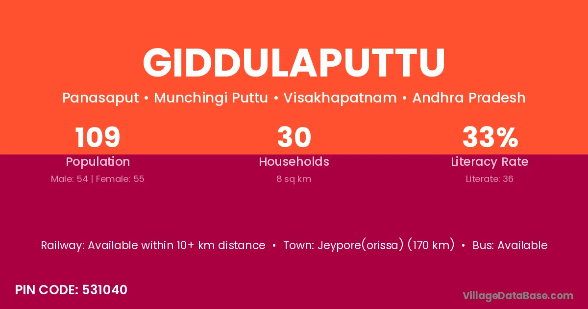 Giddulaputtu village has a total population of 109 people, of which 54 are males and 55 are females.