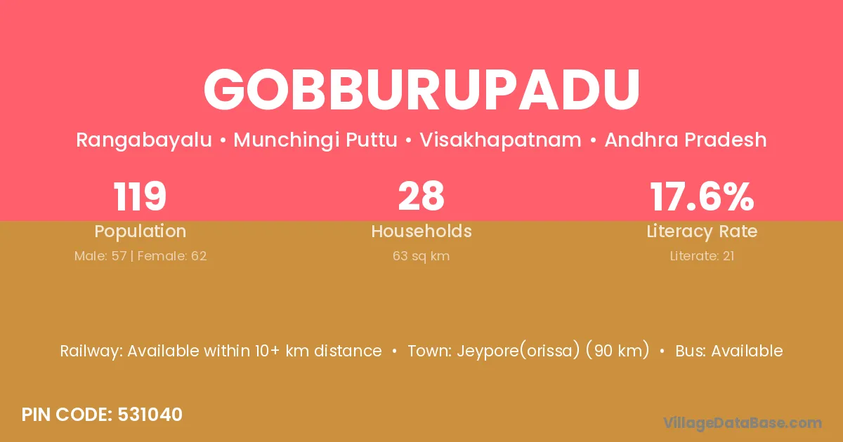 Gobburupadu village has a total population of 119 people, of which 57 are males and 62 are females.