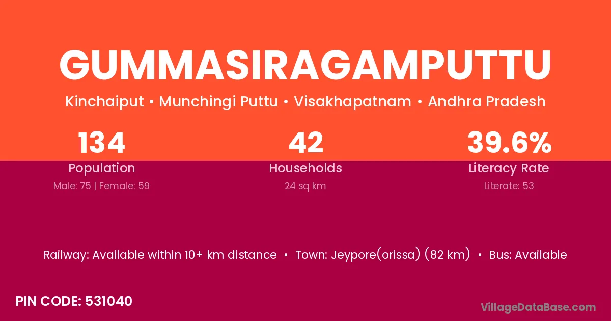 Gummasiragamputtu village has a total population of 134 people, of which 75 are males and 59 are females.