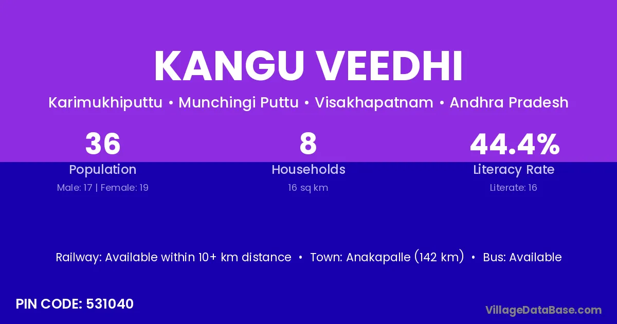 The literacy rate of Kangu Veedhi village is 44.44%. Male literacy stands at 70.59% and female literacy at 21.05%.
