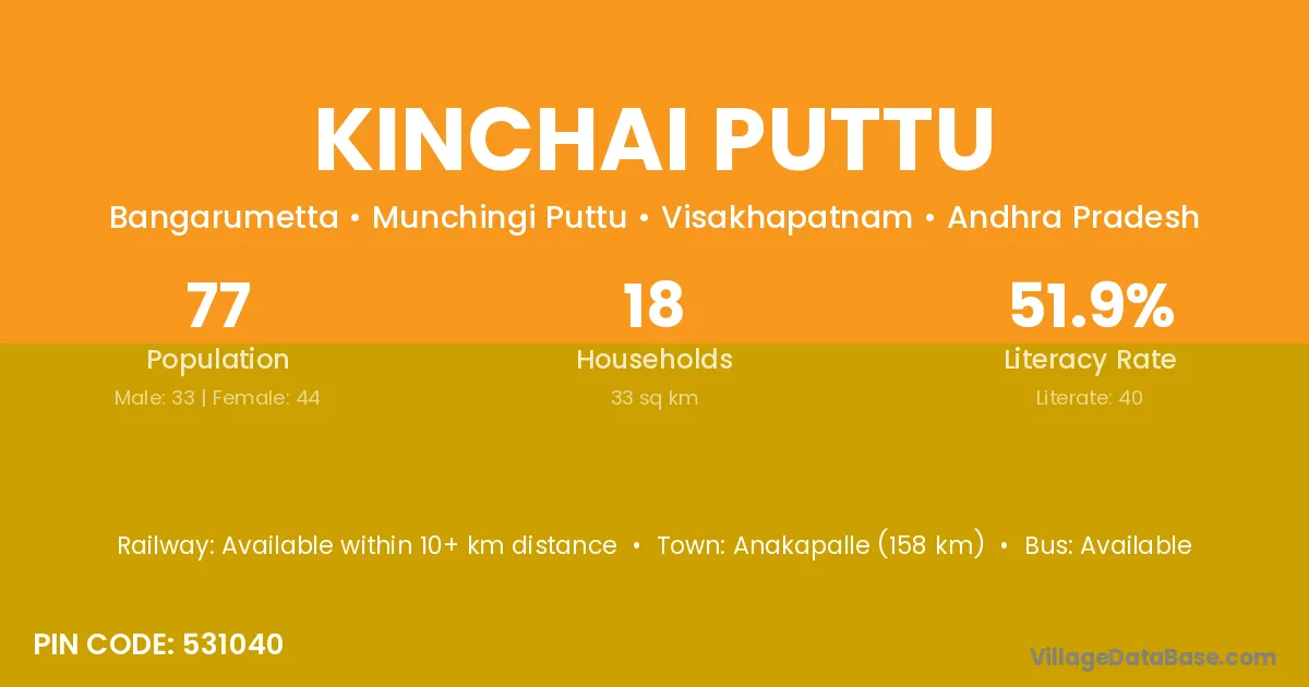 Kinchai Puttu village has a total population of 77 people, of which 33 are males and 44 are females.