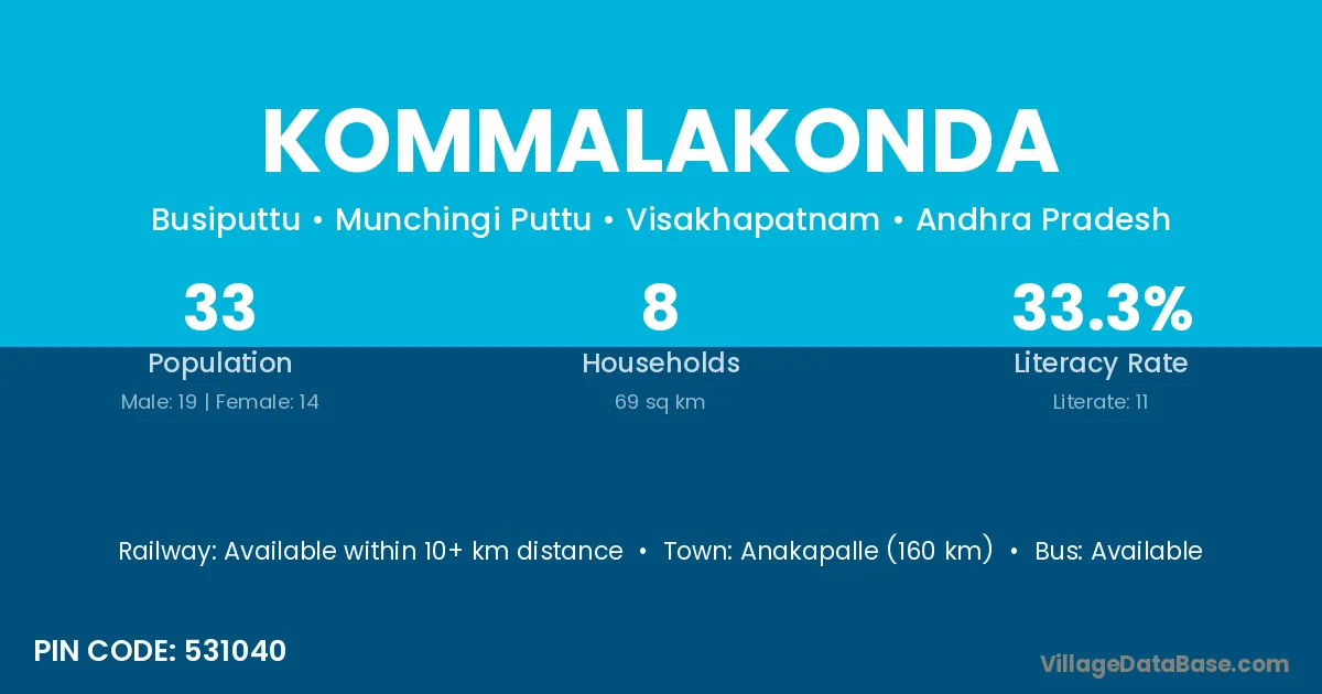 Kommalakonda village has a total population of 33 people, of which 19 are males and 14 are females.