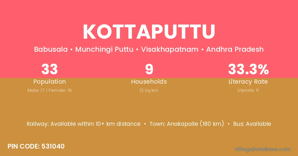 Kottaputtu village has a total population of 33 people, of which 17 are males and 16 are females.