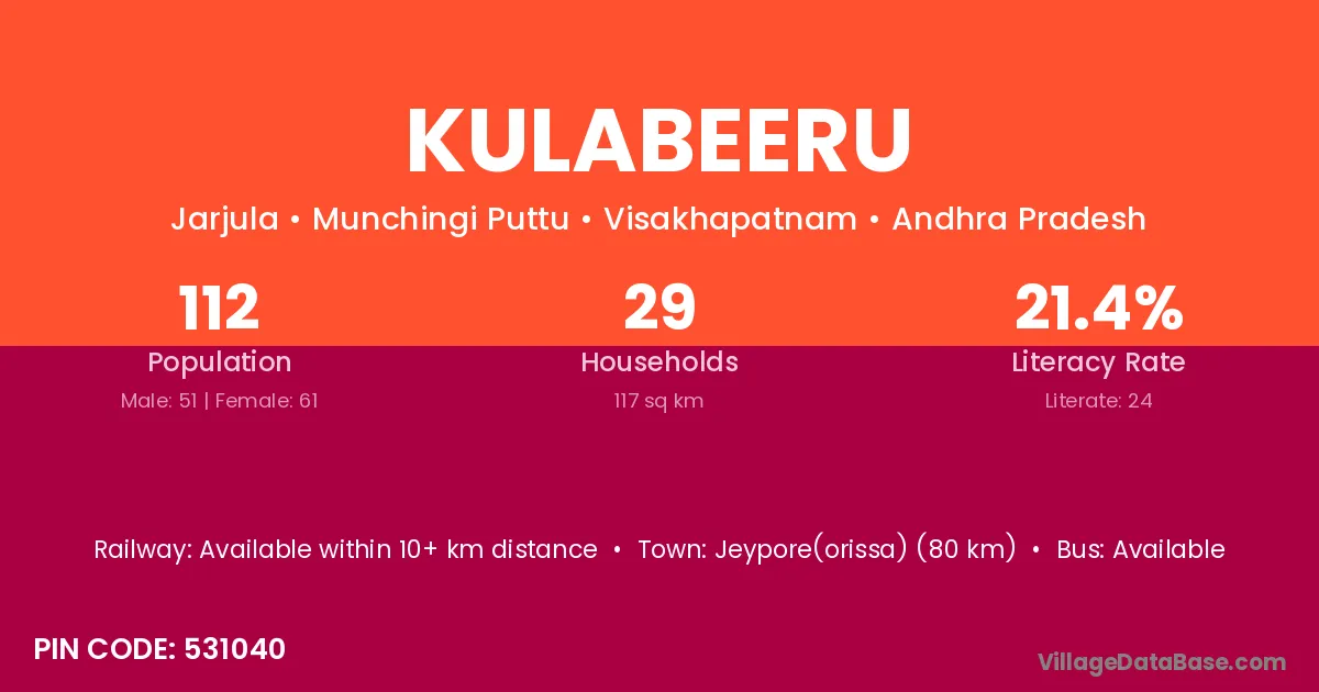 Kulabeeru village has a total population of 112 people, of which 51 are males and 61 are females.