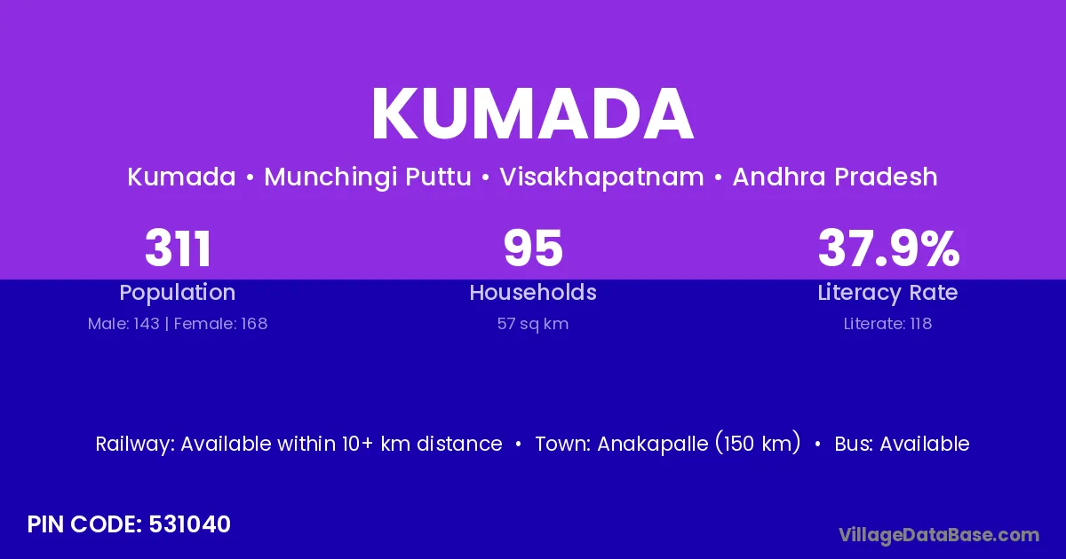 Anakapalle (150 km) is the nearest town to Kumada village for major economic activities and is located approximately 150 km away.