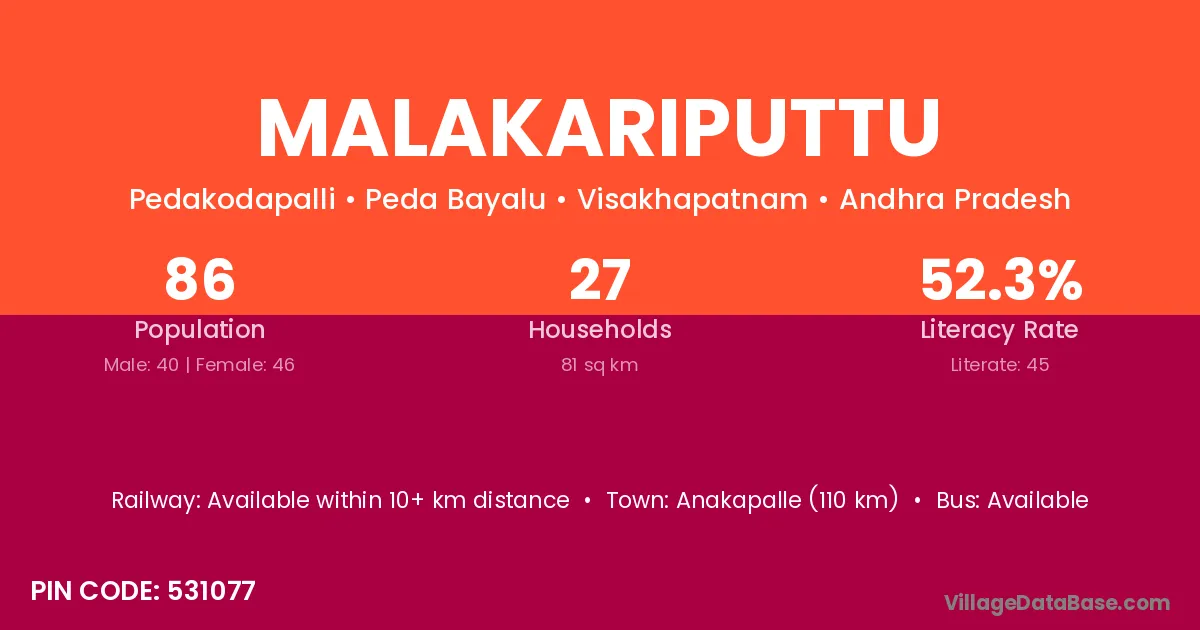 Anakapalle (155 km) is the nearest town to Malakariputtu village for major economic activities and is located approximately 155 km away.