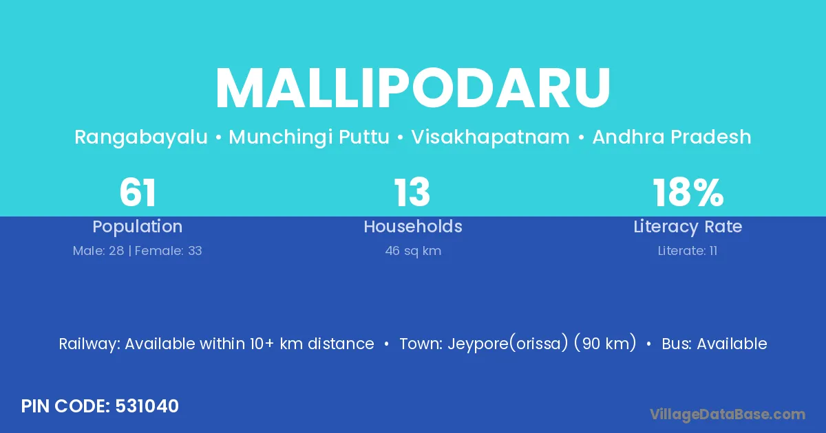 Mallipodaru village has a total population of 61 people, of which 28 are males and 33 are females.
