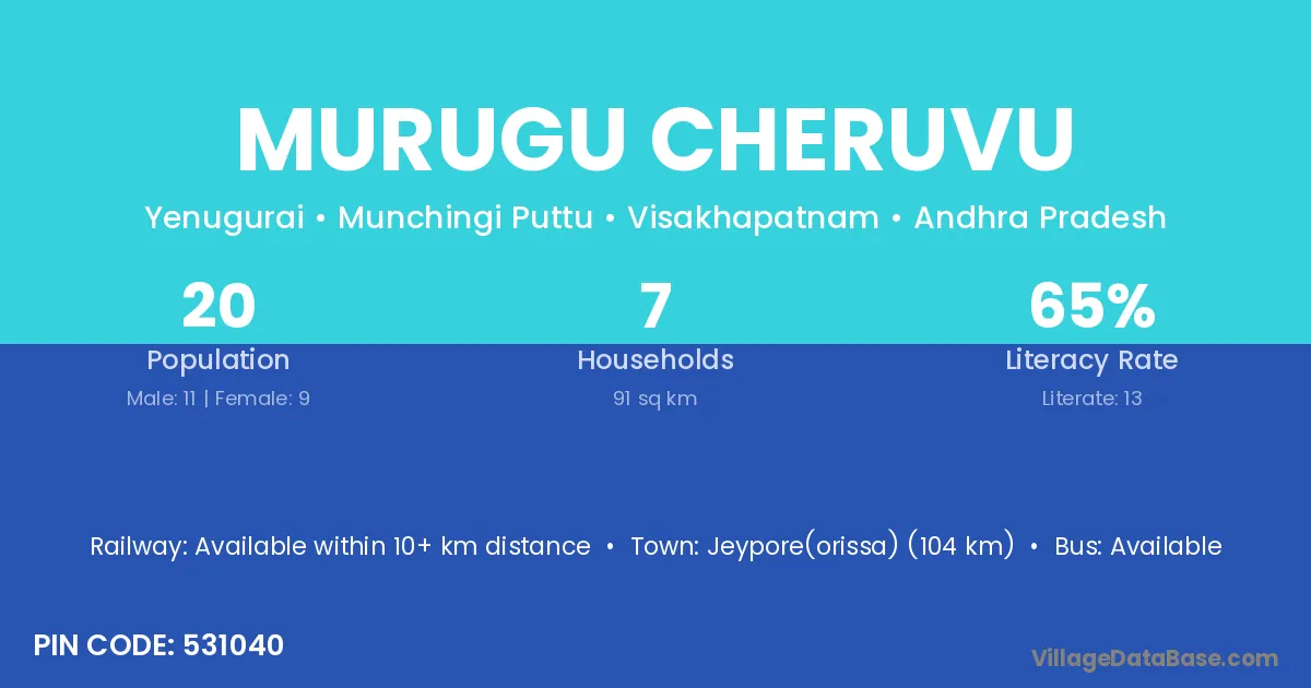 Murugu Cheruvu village has a total population of 20 people, of which 11 are males and 9 are females.