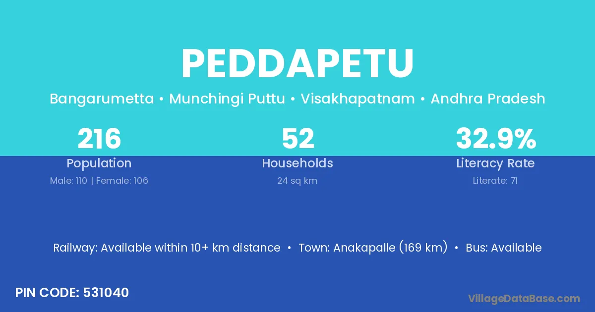 Peddapetu village has a total population of 216 people, of which 110 are males and 106 are females.