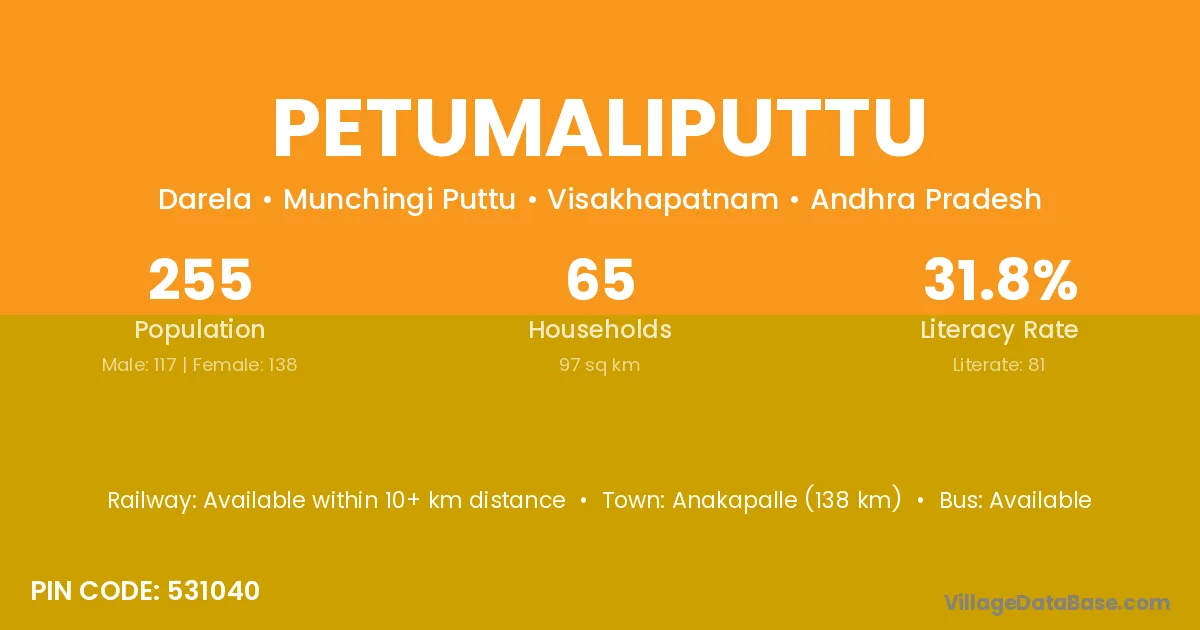 Anakapalle (138 km) is the nearest town to Petumaliputtu village for major economic activities and is located approximately 138 km away.