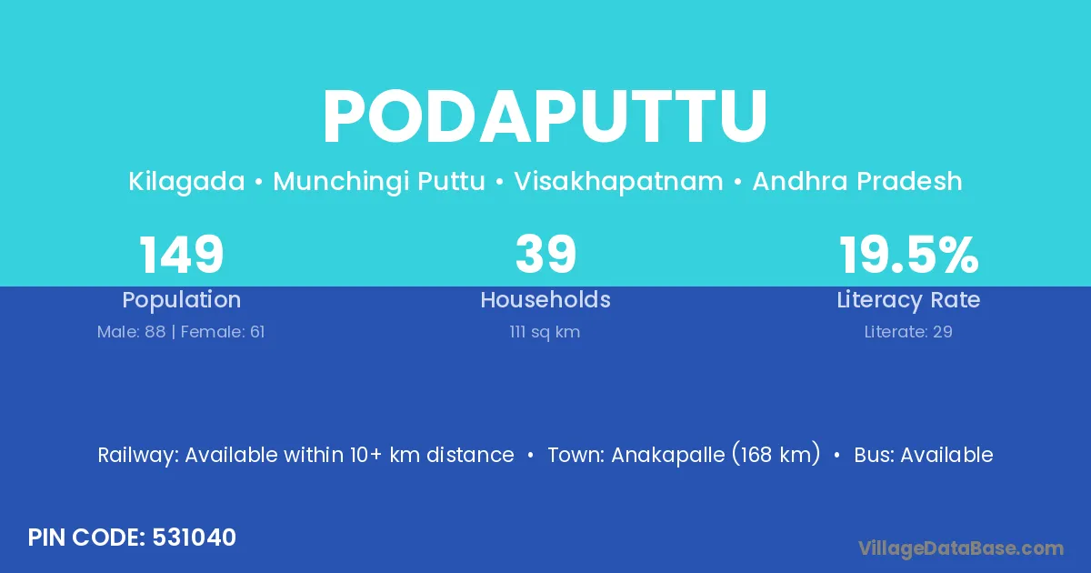 Anakapalle (168 km) is the nearest town to Podaputtu village for major economic activities and is located approximately 168 km away.