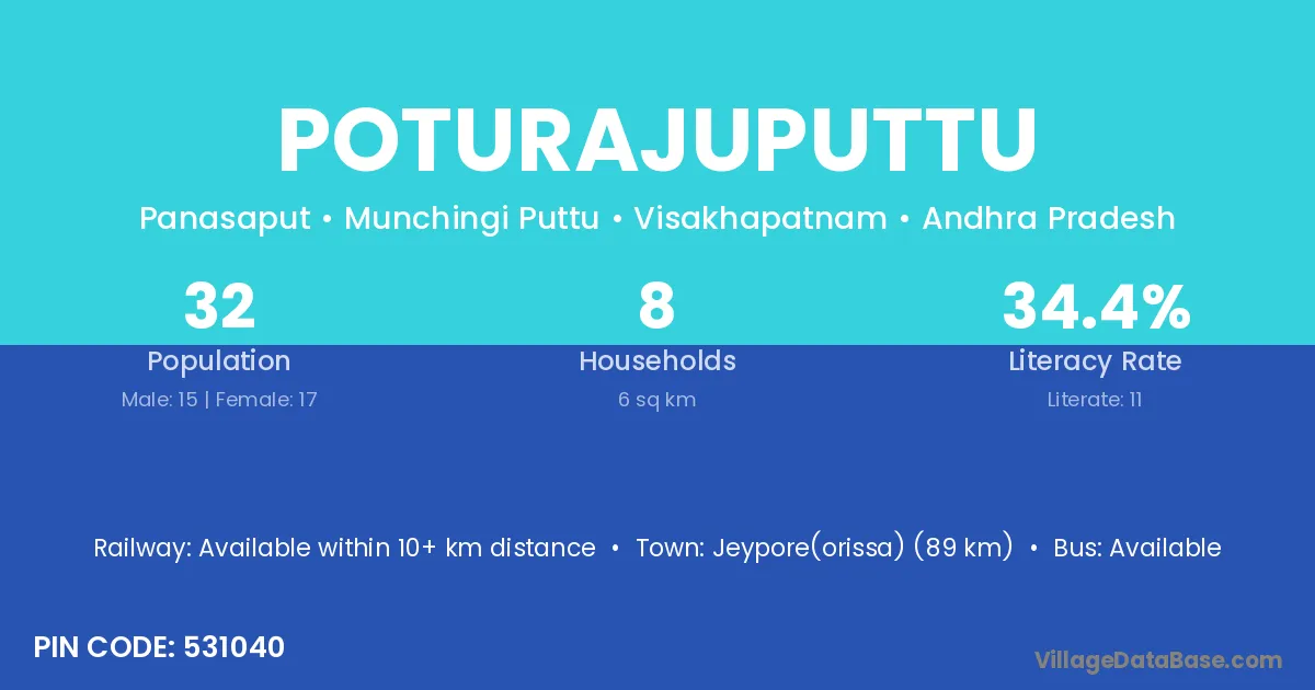 Poturajuputtu village has a total population of 32 people, of which 15 are males and 17 are females.