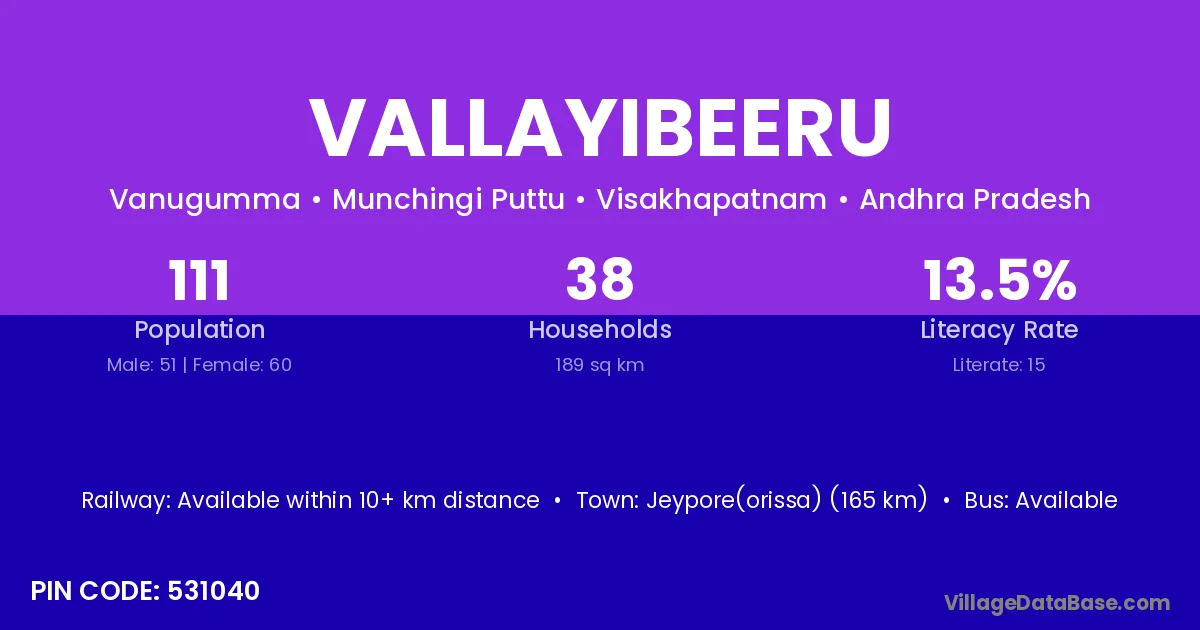 Vallayibeeru village has a total population of 111 people, of which 51 are males and 60 are females.