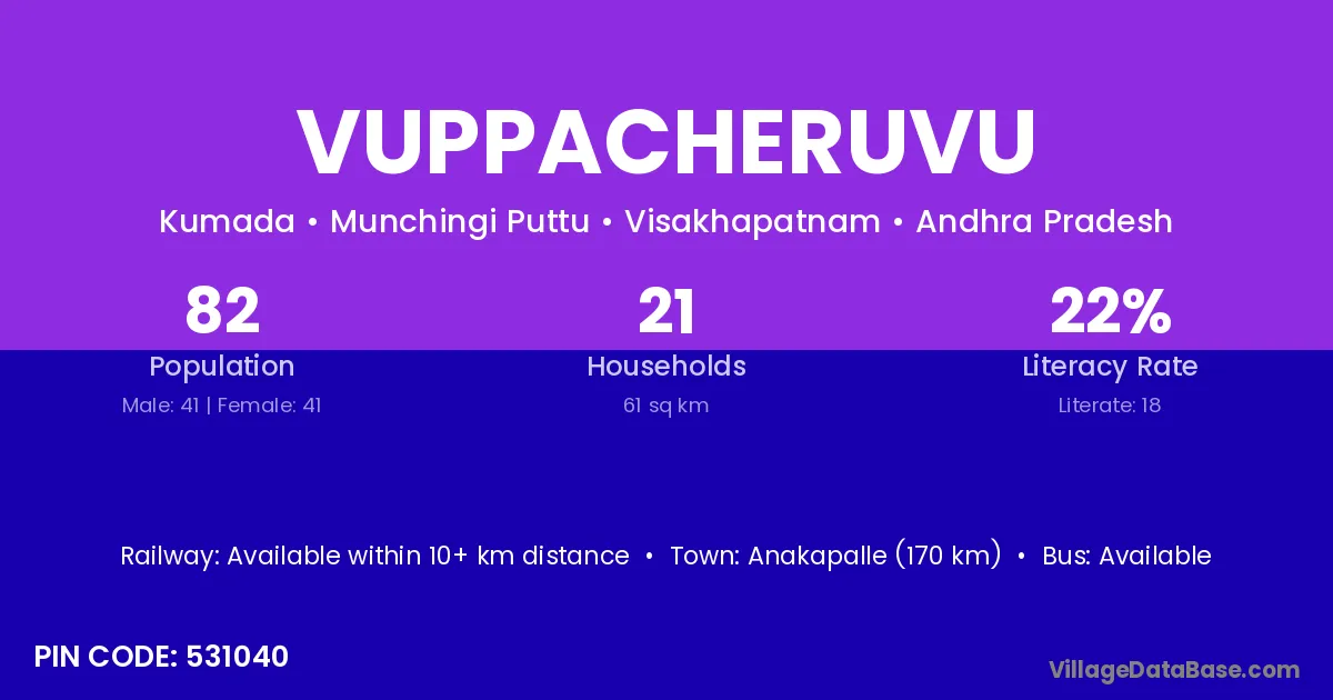 Vuppacheruvu village has a total population of 82 people, of which 41 are males and 41 are females.