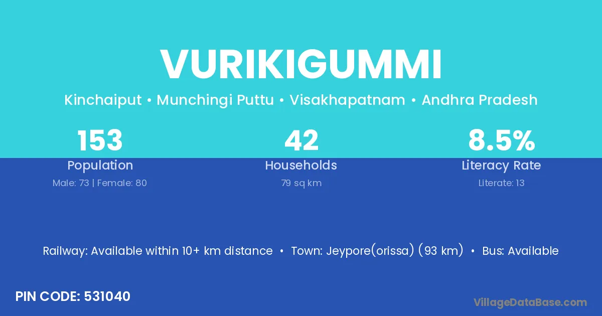 Jeypore(orissa) (93 km) is the nearest town to Vurikigummi village for major economic activities and is located approximately 93 km away.