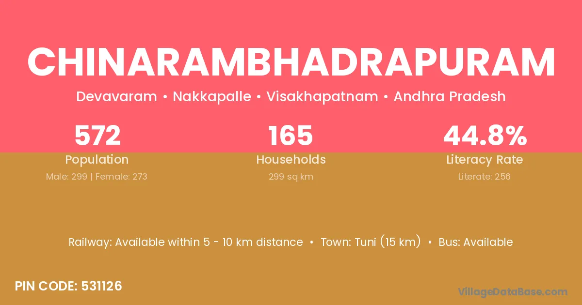 Chinarambhadrapuram village has a total population of 572 people, of which 299 are males and 273 are females.