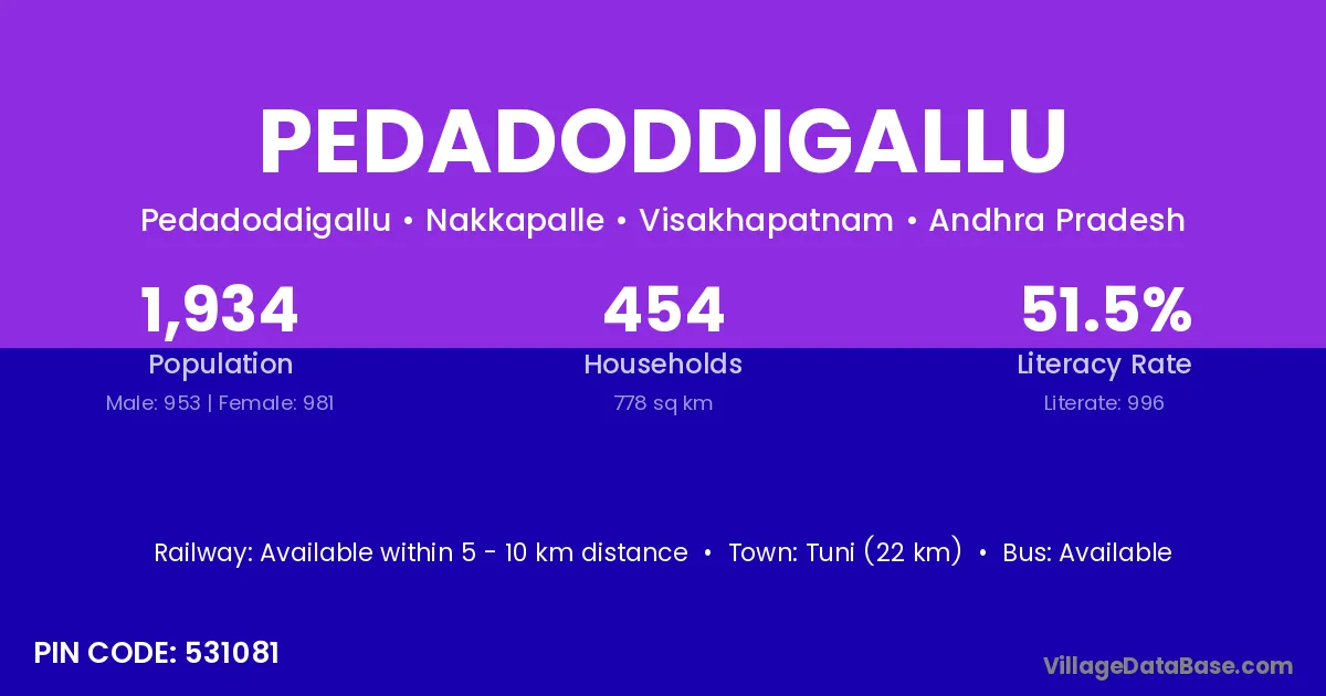 Tuni (22 km) is the nearest town to Pedadoddigallu village for major economic activities and is located approximately 22 km away.
