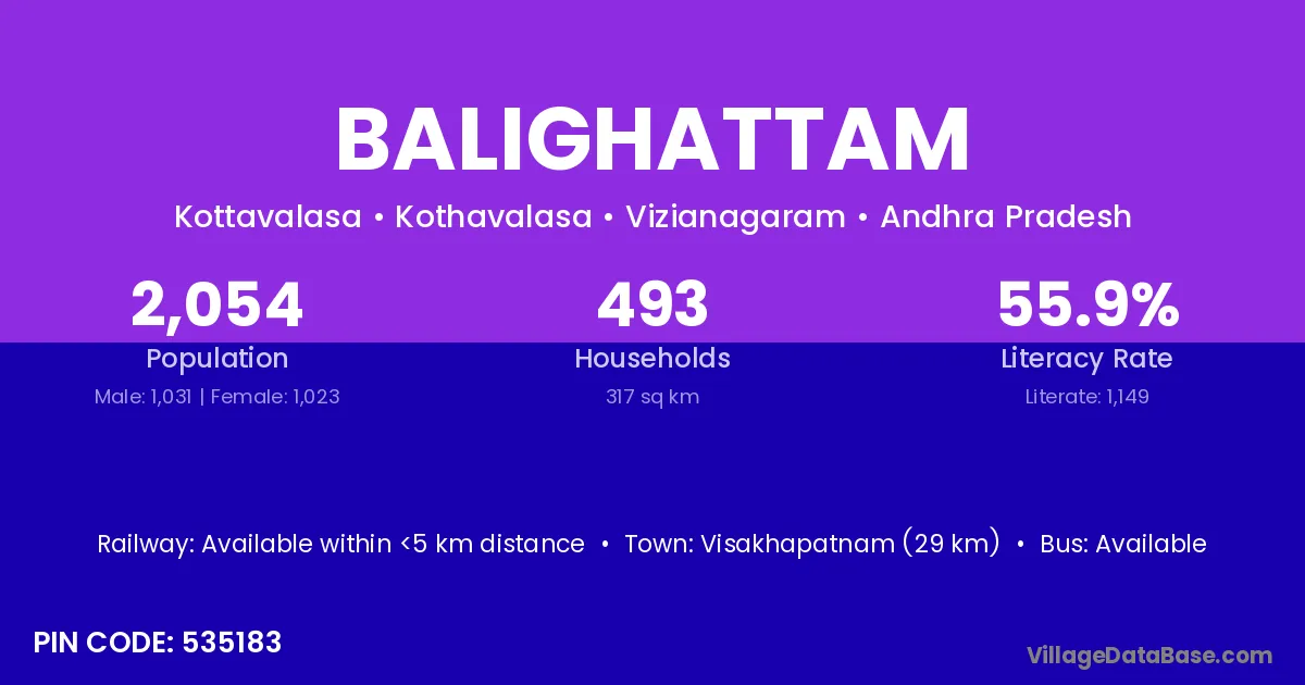 Anakapalle (43 km) is the nearest town to Balighattam village for major economic activities and is located approximately 43 km away.