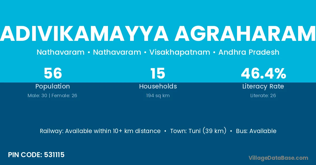 Adivikamayya Agraharam village has a total population of 56 people, of which 30 are males and 26 are females.