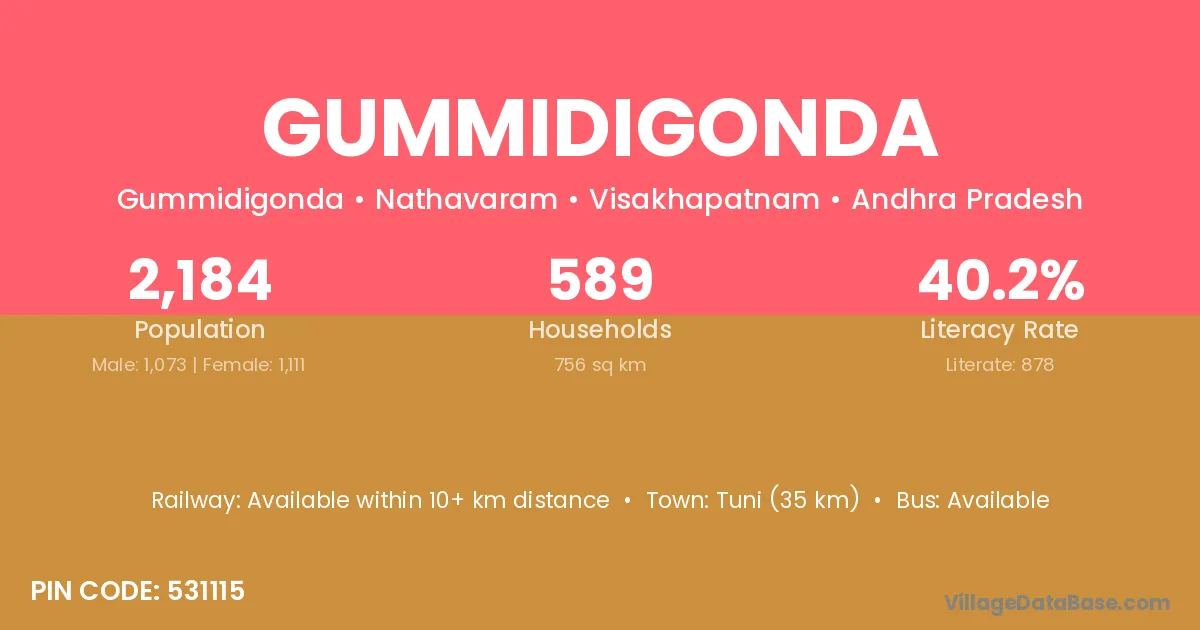 Tuni (35 km) is the nearest town to Gummidigonda village for major economic activities and is located approximately 35 km away.